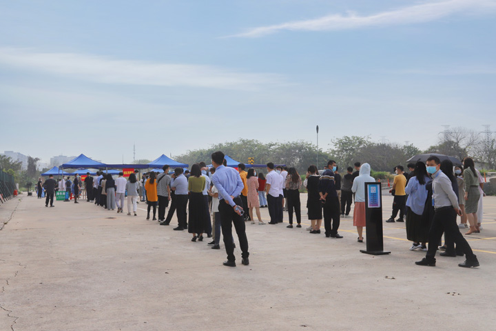 核酸检测采样点设在大厦南面露天停车场,当天上午,在工作人员的引导下,核酸采样工作分批次有序进行。检测对象佩戴口罩,提前准备好“粤核酸小程序”采样码,在指定的采样地点保持一米距离排队等候。完成采样的人员,按指引有序离开采样点,整个过程秩序井然,迅速高效。为照顾孕妇、老人及行动不便者等特殊群体,采样点还开辟了“绿色通道”,为他们优先完成采样。